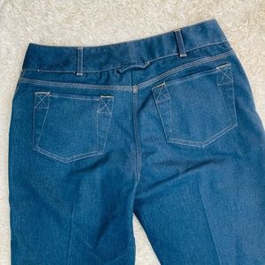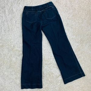 Blue, boot leg, 4 pocket, belt loop pants with a snap button and zipper closure.
