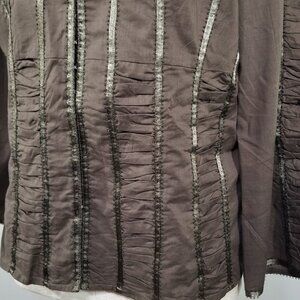 W Work Weekend M Mandarin Collar Embellished Shirt Ruched Panels Ribbon Trim Brn
