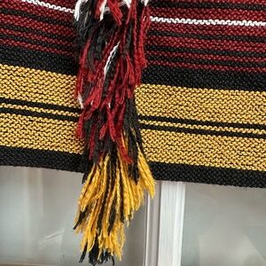 Vibrant skirt with burgundy, black, and gold stripes. Features unique fringe details. Perfect for a bold look.