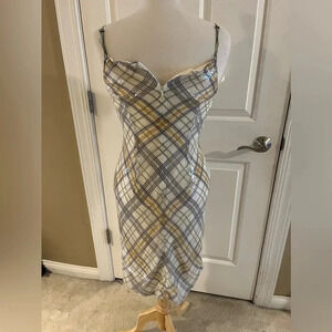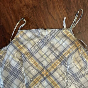 This is a perfect dress for fall and upcoming holiday season! This has a paralyzed sequence that cover the entire dress. This is on top of the gray yellow and cream plaid pattern. This is a spaghetti strap dress, and the straps are adjustable and this zips in the back. On my manikin, her shoulder and back is too broad so I didn’t want to zip it all the way you know to stress the zipper so the very last picture on here shows the dress zipped up. Anyway, I don’t have any flaws on this dress it is in,