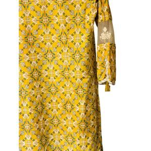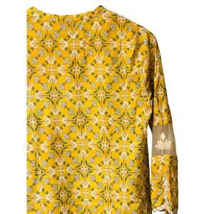 • Style Details: Beautiful yellow tunic dress with a floral print, featuring a split neckline, three-quarter sleeves with sheer panel details, and side slits for comfort and movement. Lightweight and perfect for casual or semi-formal wear.