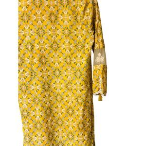 •	Style Details: Beautiful yellow tunic dress with a floral print, featuring a split neckline, three-quarter sleeves with sheer panel details, and side slits for comfort and movement. Lightweight and perfect for casual or semi-formal wear.