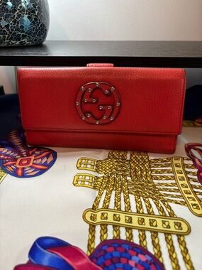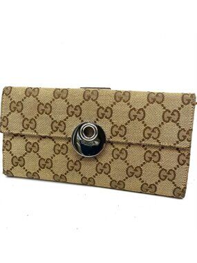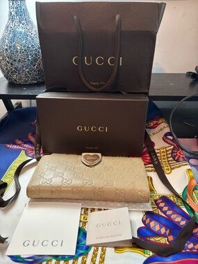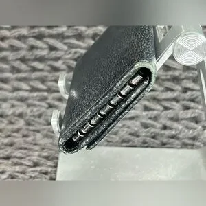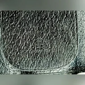 Model DEPOS with serial number 033-09590851 under the business card flap. The silver metal perfectly accentuates the leather. Leather is not smooth but slightly pebbled allowing a tactile feel of control when being used. Key rings and holder has a burnished look in a "gun metal" color. Nearly impossible to find on the internet except a purple one from Japan on e-bay in much worse shape, Many look similar but have cloth exteriors. Don't be fooled. Leather still extremely lustrous. The perfect key holder for smaller hands. The edges show some wear, but that is to be expected from an item which has held up under use. Please see photos as they are part of the description. Please note: Photo of interior showing the snap and reverse of Gucci ID is not damaged, the darkness is simply the reflection of the leather.