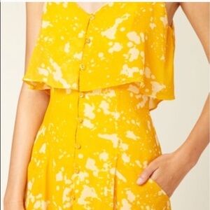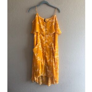 Ink blotch pattern on chiffon scoopneck large ruffle neckline spaghetti shoulder straps button front dual draped side pockets hi-lo hem about 46" from shoulder to longest point of hem polyester fully lined . Color: yellow