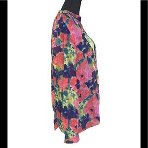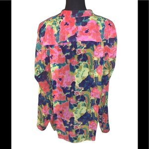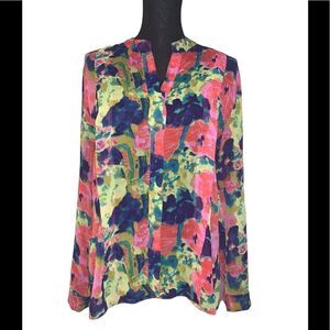 Multicolor sheer button down blouse. V-neck. Collarless. Long sleeve with button cuff. 100% polyester. Size: medium. Preowned in good condition.