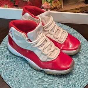 These are the Air Jordan 11 Retro "Cherry" sneakers, also known as "Varsity Red". This colorway of the iconic basketball shoe was released on December 10, 2022, with a retail price of $225.
