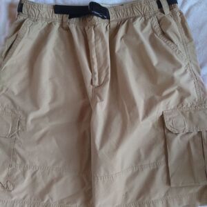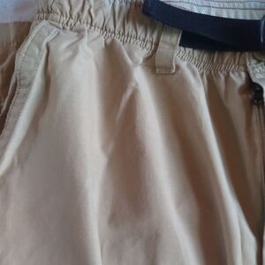 Khaki shorts, black belt, velcro front pockets,