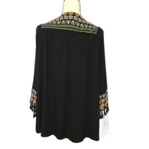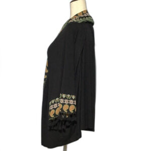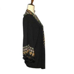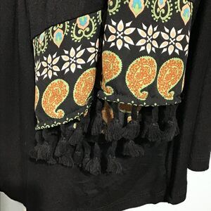 Elevate your ensemble with this W5 plus-size open front jacket, showcasing a striking black and orange paisley print with fringe sleeves for stylish flair. Perfect for layering, its relaxed fit ensures comfort and effortless styling for diverse occasions.