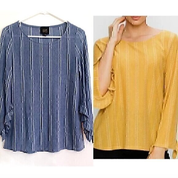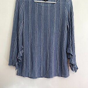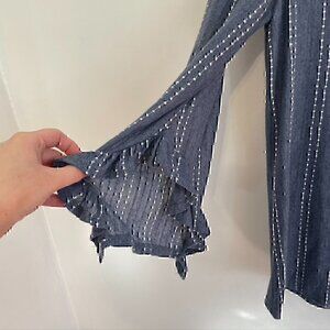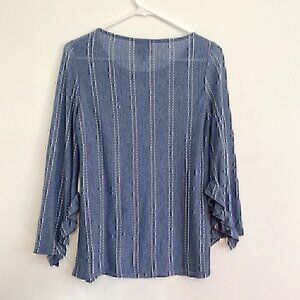 W5 ANTHROPOLOGIE Mariana Blouse Dot Stripe Blue White Ruffle 3/4 Sleeve Boho Top