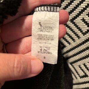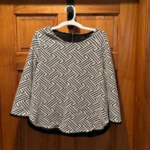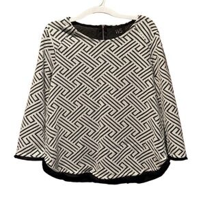 W5 geometric print textured top in white & black. 3/4 length sleeves. Fringe hem. Pullover with zipper closure in back. Women's size small. Gently used with no flaws.
