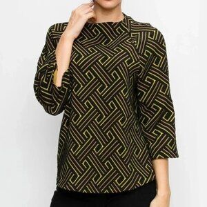 - Details: Mock neck, Geometric print, 3/4 sleeve, Puff sleeve, Zip back closure, Relaxed fit