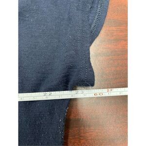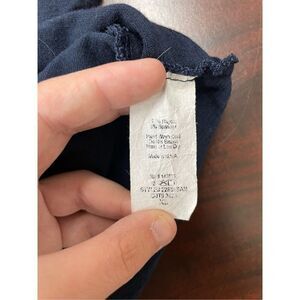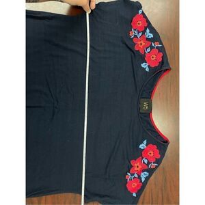 Lightly used. Navy blouse with red flowers on shoulder area. Flowers are embroidered. Had a tie front. Armpit to armpit laid flat measures about 23 inches.