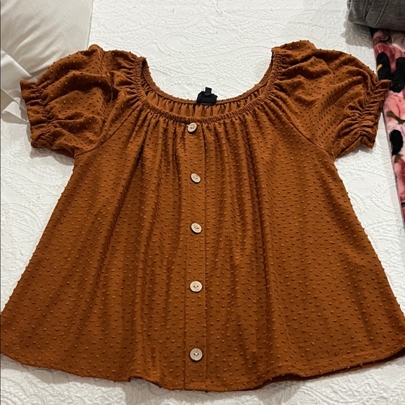 Chic rust blouse with button-front. Features puff sleeves and textured fabric. Ideal for casual wear.