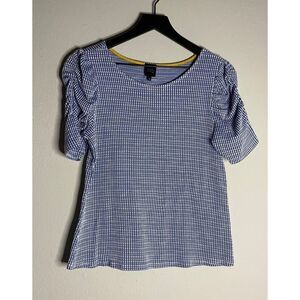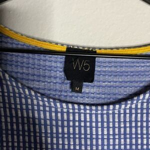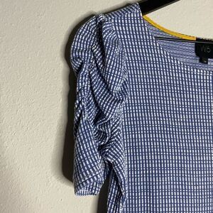 Textured knit top in blue and white from W5. Elasticized, puff sleeves. Size M. Approximate flat lay measurements- Bust: 18” across from armpit to armpit. Length: 22.5”. Gently preowned condition with no tears or stains.