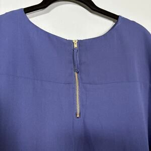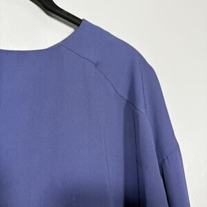 Women's minimalist corpcore blouse by W5. This blue top has 3/4 length raglan sleeves, a zipper closure in the back, and a scoop neck and hem. It is a lightweight 100% polyester.