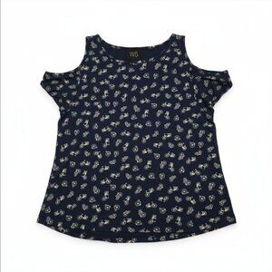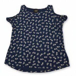 W5 ✦ Womens Navy Cold Shoulder Top S ✦ Rayon Bicycle Print Casual Pullover