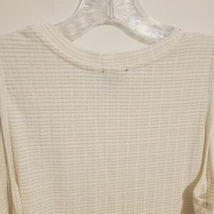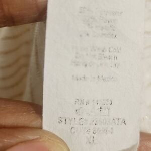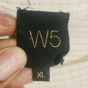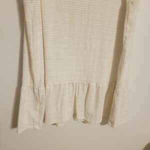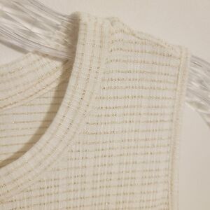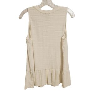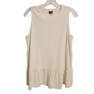 Women's white and gold, metallic, sleeveless, ruffle, peplum top by W5, size XL. Fabric blend of polyester, rayon, spandex and cotton. Crewneck top has stripes and gold flecks throughout. Excellent pre-owned condition; no flaws.