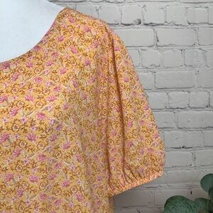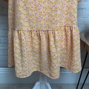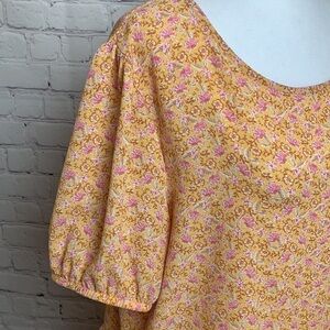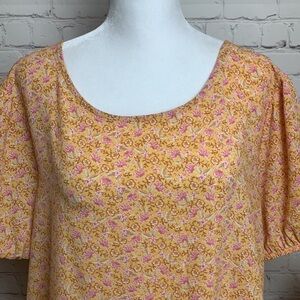 W5 Yellow Prairie Floral Peplum Blouse in a flowy silhouette. Short sleeves. Elasticized sleeve hems. Easy care. Very good used condition. Size Large. Measurements in photos.