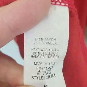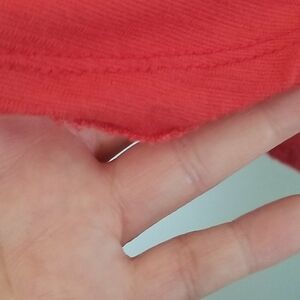 Sharkbite hem. A small part of hem has come un done. Super soft stretchy fabric, very comfy. I would call this orange, looks like it could fall under the light red category. In the back has a peplum type back. Super cute.