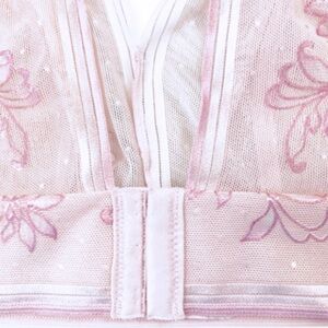 Plunge front and triangular neckline, soft wide bottom band. Wide non-adjustable straps with hook & eye back closure.