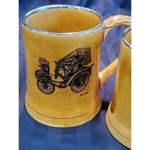 Very unique vintage set of 2 ceramic/pottery beer steins. A Moko product by Wade England. Steins feature image on antique automobiles. Design authenticated by Veteran Car Club of Great Britain. Set of 2.
