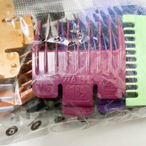 Description: Style with ease using the WAHL Color Coded Cutting Guides for all barber and salon including personal at-home haircuts. The WAHL Color Coded Cutting Guides Kit consists of a variety cut guards with specific color, size and length. The color coded helps to identify specific color and remember the correct cut length to style the hair. This kit of WAHL Color Coded Cutting Guides contain approximately more than 10 guards, WAHL blade oil with mini brush and an additional brush. This item is new and completely sealed. Perfect kit for salon stylists, barbers, personal home haircare and great for traveling purpose.