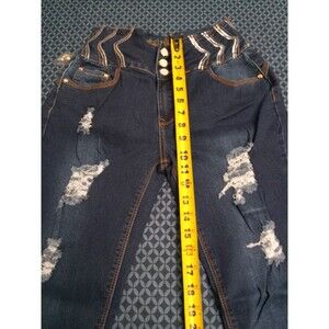 Elevate your denim game with these stylish jeans from M MICHEL. The dark blue, ripped denim features a flattering mid-rise fit and button-zipper closure. These skinny jeans are designed with a butt-lifting effect and stretch material for a comfortable and flattering fit.