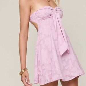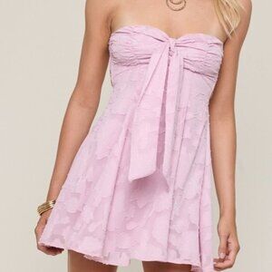 Pale Solid Color Floral Embossed Print Sweetheart Shape Strapless Front Tie Open Back with Elastic Band Back Zipper Down Swing Mini Dress SELF:100%POLY LINING:100%POLY * Model Info: Height 5'8.5" Bust 33' Waist 24'' Hip 35''