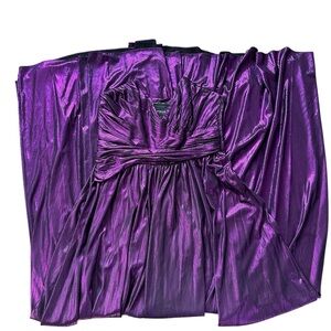 Dazzling strapless gown in vibrant purple. Features a high slit for added allure. Ideal for glamorous events.