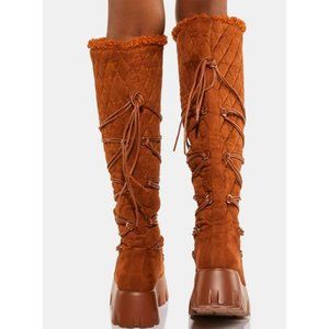 Walk On The Moon Platform Boots These boots come in a quilted construction, a lace up closure front and back design, treaded platform soles, and faux fur trim detailing at the top.