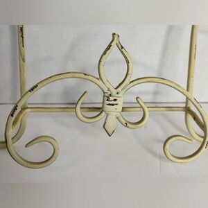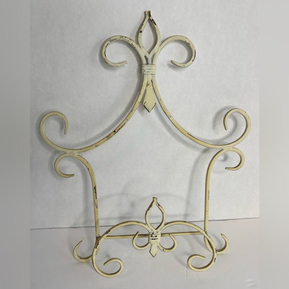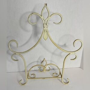 Distressed cream colored wall display rack for plate, art or a book. Has a scroll design. Made of metal. 14”X 12” X 2” Great condition