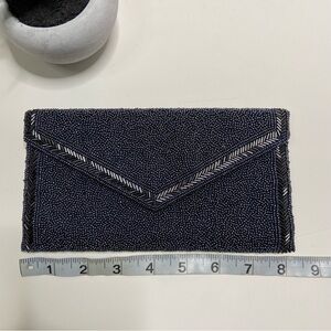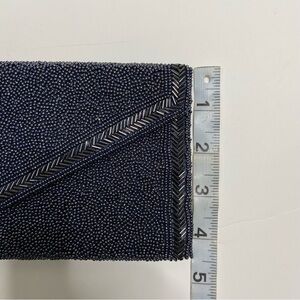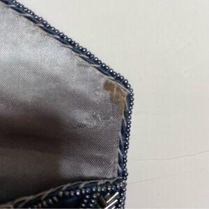Gorgeous clutch with edge detail was made in Hong Kong. Satin lining and one open pocket. Snap closure. Beautiful beads on blue satin background. Gray satin interior.