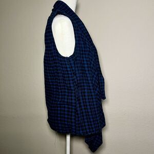 This is a WALLFLOWER women's sweater vest in a blue and black buffalo plaid pattern, made of a polyester blend fabric. It is sleeveless with an open front design, featuring a relaxed fit and size medium. This lightweight vest is suitable for winter and fall seasons, with a hipster, nature-inspired style that is perfect for the holidays and Christmas.