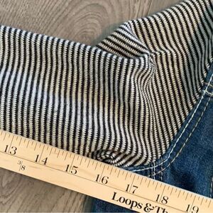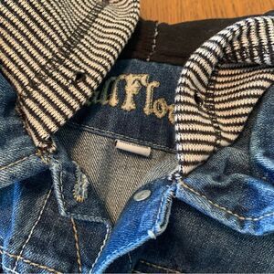 WALLFLOWER JEAN JACKET WOMEN LARGE BLUE DENIM CROP STRIPED KNIT ARM HOOD.