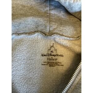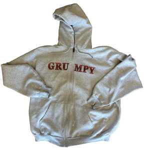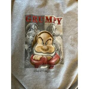 Note: see pic for stain. Experience the magic of Disney with the WALT DISNEY WORLD Grumpy full zip hoodie sweatshirt. Showcasing a sleek gray color, this versatile piece is crafted from a comfortable cotton blend and features a robust polyester fabric that stands up to daily wear. The hoodie comes in a size XL, ensuring a cozy fit for those who prefer a roomier garment. The hoodie's long sleeves, solid pattern, and iconic Disney franchise accents, including a prominent Grumpy graphic print and the classic Disney logo, make it a standout addition to any fan's wardrobe. With a convenient zip closure and a comfortable regular fit, this hoodie from Hanes' Walt Disney World product line is ideal for Disney enthusiasts looking to add a touch of whimsy to their everyday style.