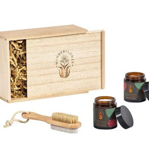 SET CONTAINS Eucalyptus and fresh mint foot scrub with a pecan shell exfoliant 100ml Eucalyptus and fresh mint foot lotion 100ml Wooden handle dual sided foot brush & pumice stone
