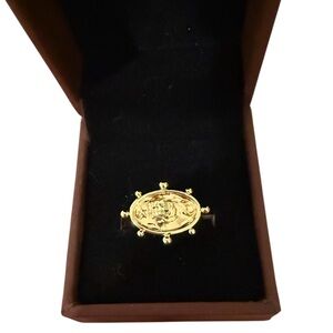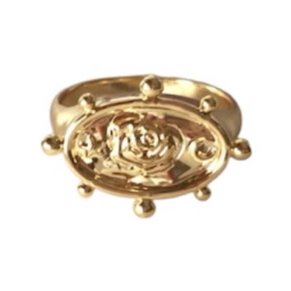 A symbol of flow and femininity, the Rhea Signet Ring is an oval faced ring plated in 14K-18K gold gilt and embossed with a crescent moon, star and a vintage rose centrepiece. New without tags. Will come in an off brand ring box.