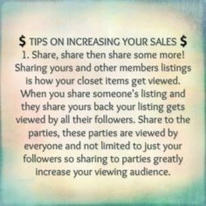 @samantha_sf_ca Let's say a group has 10 members and you are to share 10 items from each persons closet. They in turn are each sharing your closet. So your visibility is increased because the more you share the more you sell!!! Each of you have different followers. Some people have over 100k!!! So your closet is seen by more people! PLUS my favorite thing is you build relationships with other people. Makes poshmark more fun! PLEASE let me know if I can direct you to some of my favorite groups!