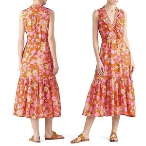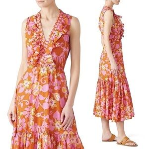 WARM 70s Tropical Floral Sleeveless Ruffle Trim V-Neck Flounce Tier Midi Dress M