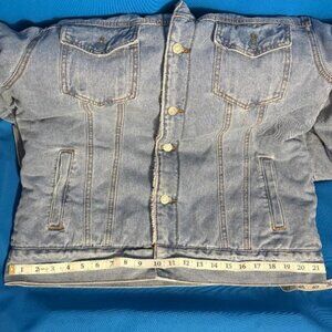 THIS IS A VERY NICE PREOWNED HEAVY & WARM FASHION BLUE JEAN DENIM JACKET WITH A SUPER NICE SHERPA TYPE & ALSO A FURRY FUZZY TYPE LINING AS SHOWN! THIS BLUE JEAN TYPE JACKET HAS A MOSTLY SOFT SHERPA TYPE LINING INSIDE & THERE'S ALSO A SOFT FUZZY FURRY TYPE LINING INSIDE THE ARMS SO YOU'LL STAY WARM & COZY THROUGHOUT THE YEAR! THIS HAS 2 CONVENIENT & FUNCTIONING SUPER ROOMY UPPER CHEST POCKETS & THEN THERE IS 2 LOWER FRONT THAT HAVE A OPENING AT THE TOP & BOTTOM OF THE POCKETS BUT THE MIDDLE PART IS SEWN TO PREVENT THEM FROM FOLDING OPEN SO THEY STAY CLOSED! THIS IS A SUPER NICE JEAN JACKET SO IF YOU'RE LOOKING FOR A COZY WARM COAT & YOU HAVE THE MEASUREMENTS TO FIT (INCLUDED BELOW & IN THE PICTURES) YOU'LL DEFINITELY WANT TO GRAB THIS UP BEFORE IT'S GONE!