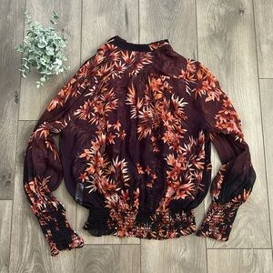Elegant women's top featuring a vibrant floral design by the brand Warm. Perfect for adding a touch of color to your wardrobe. Sheer fabric with necktie. Waist and cuffs have cinched elastic for elegant fit. Pit to pit is 25". 100% viscose. Made in the USA with imported materials. Estimating a size Medium. EUC.