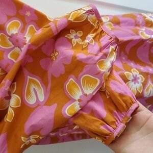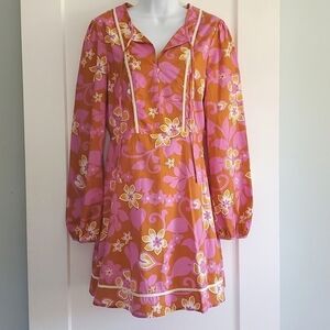 Beautiful 100% cotton dress by designer WARM. This is the Chelsea dress with a beautiful fun vibrant retro floral pint and orange print!