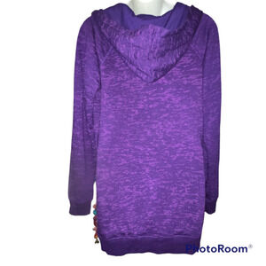 Bright purple knit hoodie (not fleece) with deep v-neck, long sleeves, and kangaroo pocket. Perfect for layering over or under.