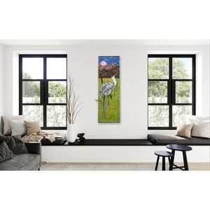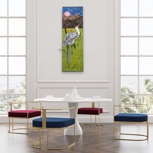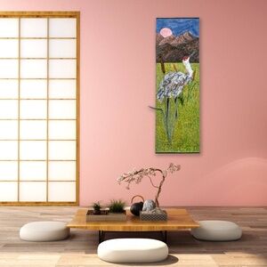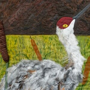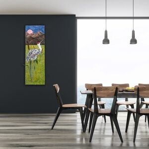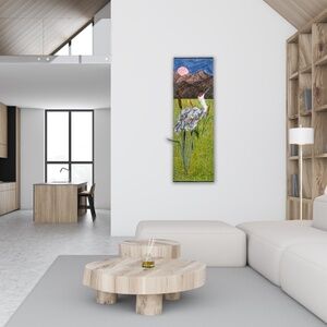 A Sandhill Crane, who spends winters here in the Rio Grande Valley in Albuquerque, with the Sandia Mountains in the distance. Sandia is Spanish for watermelon due to the beautiful pink the mountain becomes at sundown. Painted and stitched silk, found feathers, and other fabrics. Ready to hang with sleeve and wood slat. Hang away from direct sunlight or strong indoor lighting. 65 x 21 x 1 inches.