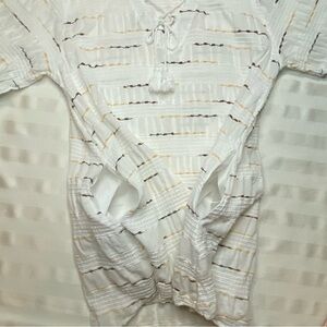 Stylish white tunic style cover-up with lace-up top. Perfect for beach/pool wear. It has a pattern of something kind of like smocking and gathered sections in between the embroidery.