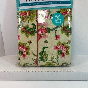 The product is a new Waverly PEVA flannelback tablecloth featuring a floral pattern in pink, green, and cream colors. The oblong shape measures 60 x 84 inches, making it suitable for various dining table sizes. The traditional style and garden theme add a touch of fun and curiosity to any dining area. Easy to care for, this cloth material can be wiped clean with a damp cloth, ensuring convenience and practicality in maintaining your tablecloth.