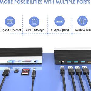 Up for sale is a versatile USB C laptop dock with 13 connection ports, including USB 3.0, HDMI, DisplayPort, Ethernet, a range of card readers, power port, and an audio jack. It supports triple display with various resolution options, ensuring an impressive visual experience with up to 4K at 60Hz video output. Charge your laptop fast with 100W power delivery, and enjoy super-speed data transfer rates of up to 5Gbps with additional rapid-charging for your phone. This dock suits many laptops, such as newer MacBooks, Chromebook Pixel, and others with a full-featured type-C port, eliminating the hassle of multiple cables. It's perfect for anyone looking to expand their computer's capabilities, whether for work or entertainment. (Note: Mac OS may have limitations with display modes.)