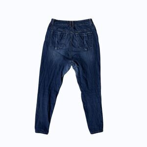 Features: medium to dark wash stretch denim jeans. Booty lifting design. Distressed details.