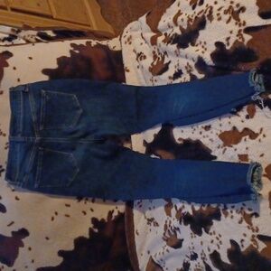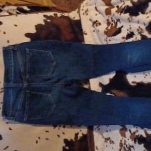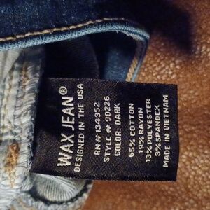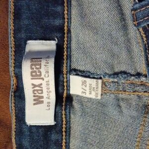 WAX JEAN LOS ANGELES CA. WOMENS JEAN, SIZE 3/26. 5 POCKET, DISTRESSED BUTTON UP FLY. MEASUREMENTS ARE BELOW APPROX.