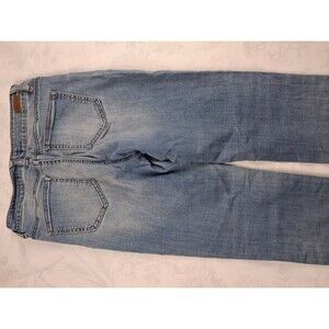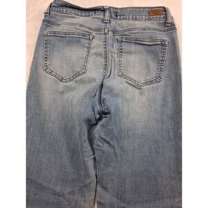 The product is a pair of WAX JEAN Los Angeles torn knee distressed skinny jeans in a light blue color. These jeans feature a solid pattern, zip and button closure, and a cotton blend denim fabric wash. With a mid-rise fit and a slim fit style, these jeans have a 24-inch inseam and are designed for women. The distressed detailing adds a unique accent to the overall look of the jeans.